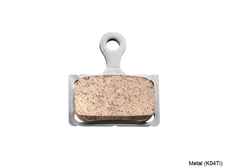 Shimano Metal disc brake pads K04Ti suitable for BR-R9170, BR-RS805, BR-RS505, BR-RS405, BR-RS305 and BR-U5000 disc brakes. Titanium base plate. Without cooling ribs.